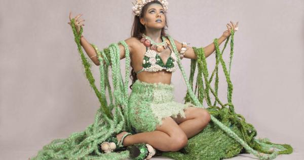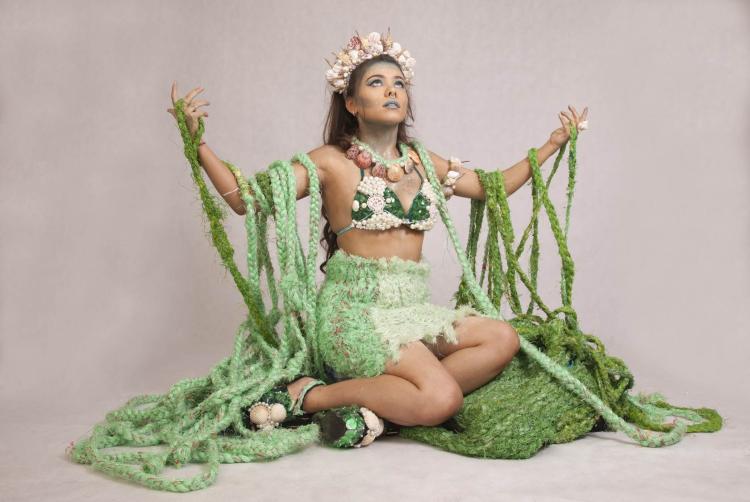 Rising Tide, made from hay bales, netting, shells and green plastic, is modelled by Charlotte Wright, and created by Lauryn Jane Conory and Clodagh O'Brien.