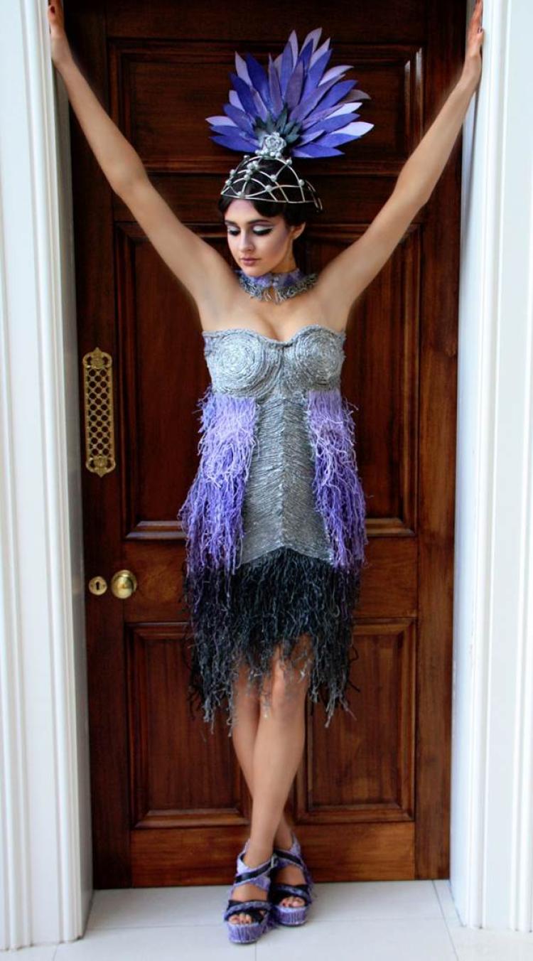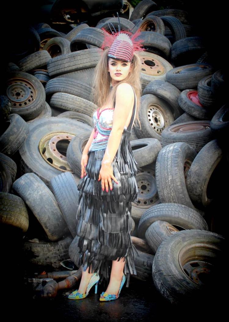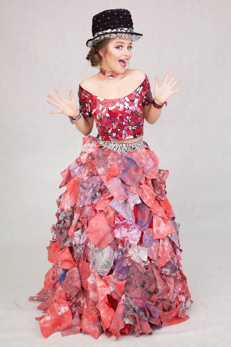 Moulin Rouge is made from CDs, nail polish, baby wipes and paint, by Samantha Hauberte and Valencia Kienge, modelled by Bethany Hayes.