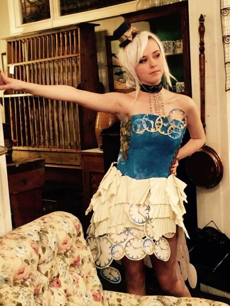 Clockwork in the Making is made from old school journals, calendars, diaries and broken watches, by Megan Farrell and Aaliyah Onalimi, modelled by Molly Farrell.