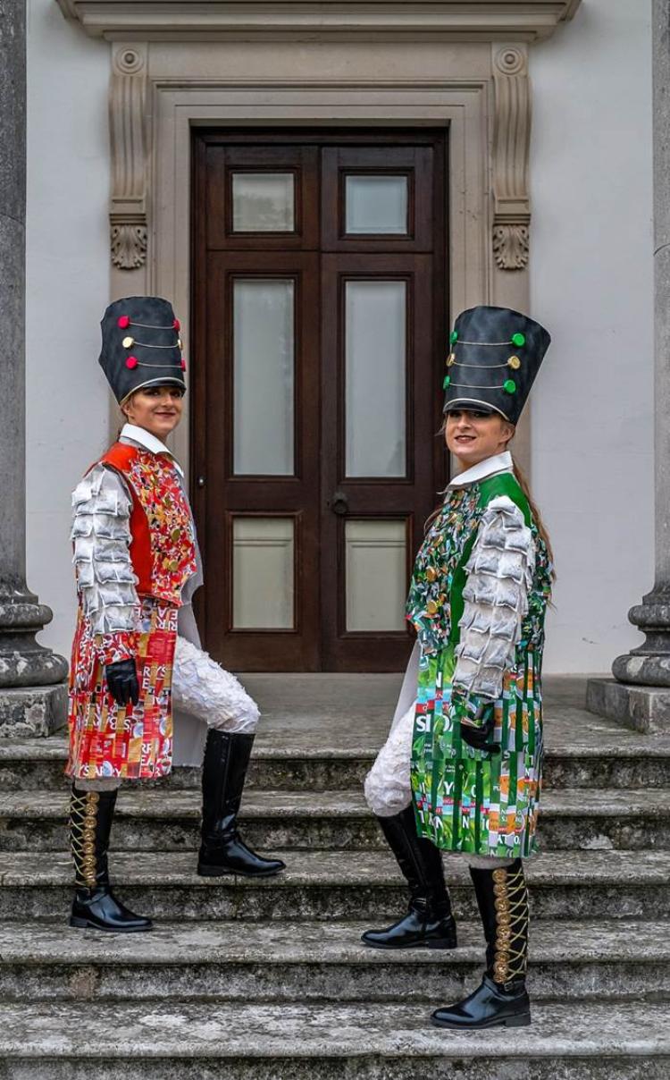 Tea Soldiers is two rival outfits made from Lyons and Barry's tea packaging, teabags, milk bottle tops and coffee pods, by Rachel Daly, modelled by Aoife and Elaine Daly.