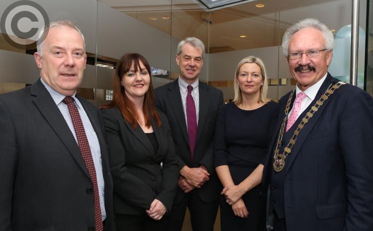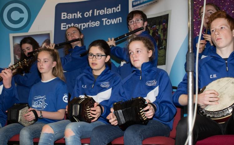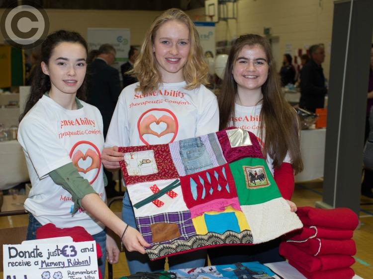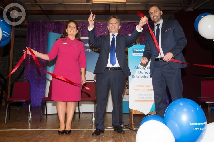 Deputy Sean Fleming with Karen Flanagan, Branch Manager, Bank of Ireland, Durrow and Jason Ryan, Branch Manager, Bank of Ireland, Abbeyleix cut the tape to officially open the Business & Community Expo at Heywood Community School in nearby Ballinakill. Picture: Alf Harvey.
