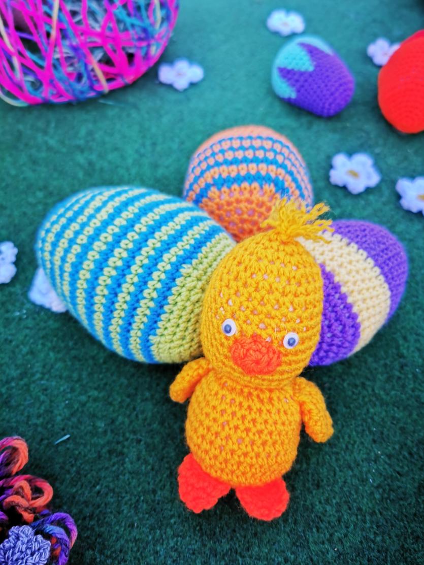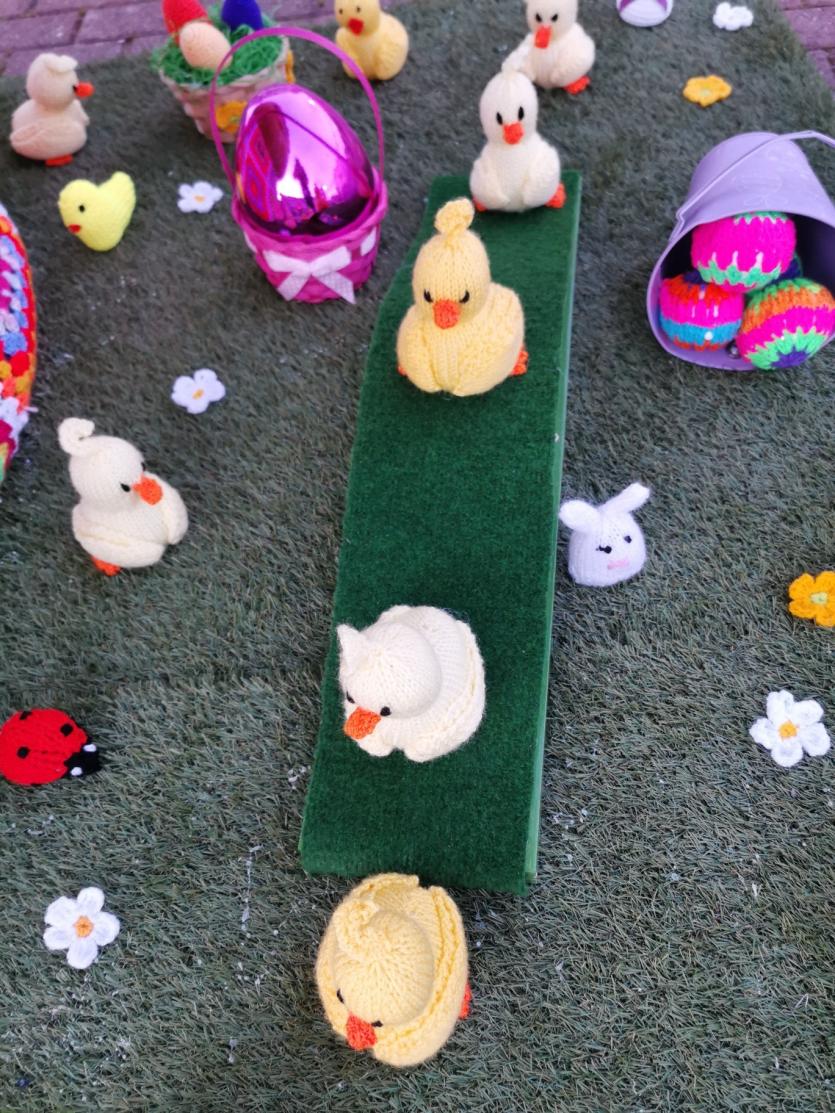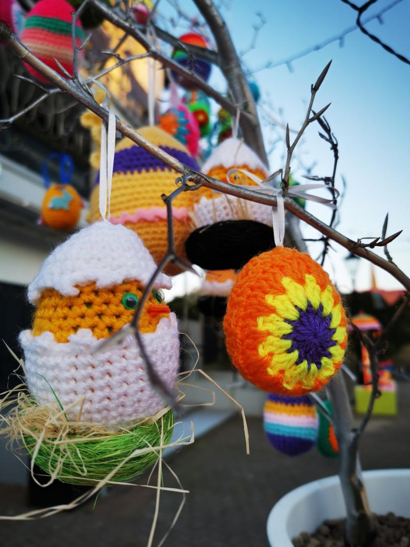 They have knitted and crocheted Easter bunnies, chicks, a giant egg, many beautiful eggs dangling from trees and much more.