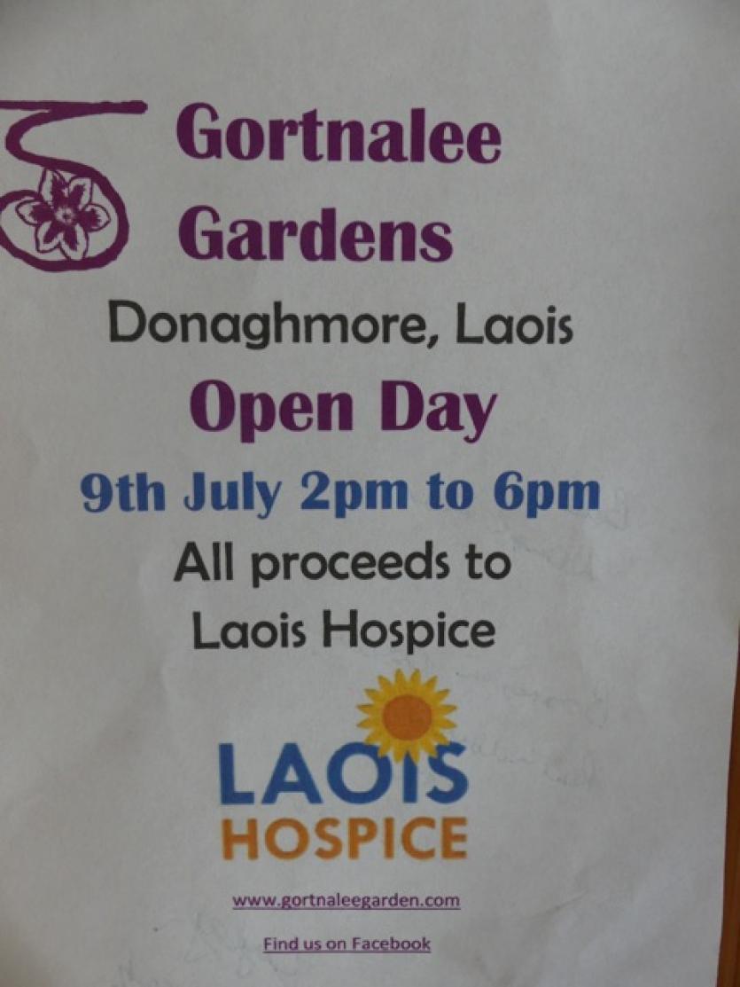 It is two years since Hazel has opened the gardens to the public. There will be light refreshments and plants for sale - so come along with your family and friends and support this day as all proceeds are for the Laois Hospice.