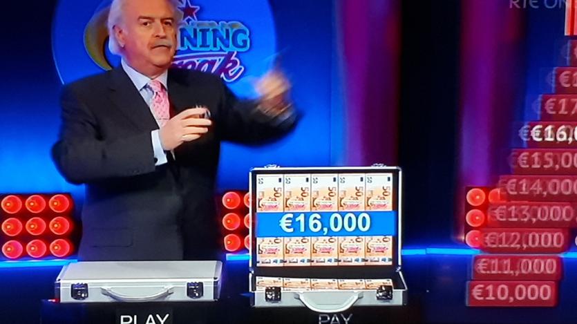 Jane works for Bank of Ireland in Mountrath and Mountmellick. Her canny banking experience came in handy when she banked her earnings in the Pay or Play game. Marty opened the pay briefcase to reveal €16,000. She chose not to play - the play briefcase revealed winnings of €11,000.