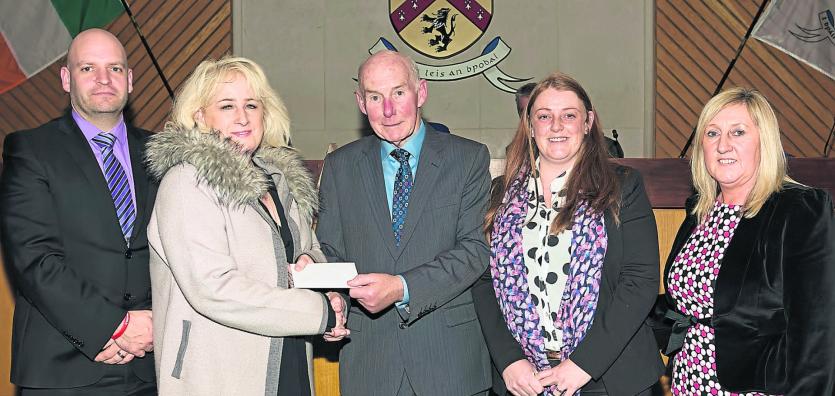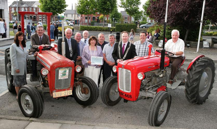 Pictured at County Hall , Portlaoise for the Chairman's Reception for the Red Eagles Vintage Tractor Group , who raised money for Teen line Ireland , with a tractor Run from Malin Head to Mizen Head ( 4th. to 7th. June ) were: ( l. to r.) Carmel Mc.Nichols ( Acting Director of Services- Laois Co. Council ) , Pat Culleton ( Chairperson -Red Eagles Tractor Driver ) , Clr Jerry Lodge (Chairperson , Portlaoise Town Council , Clr. Michael Lalor ( Tractor Driver ), Paul Murray (Chairperson -Teenline -Dublin ) , Winifred Champ-Cox ( Chairperson , Teenline Ireland M.R.O.) Eamonn Scully and P.J.Seymour (tractor drivers ) , Clr. James Daly (Chairman , Laois Co.Council ) ,Michael Lawlor and Joe Dooley ( tractor drivers) . Photo: Michael Scully