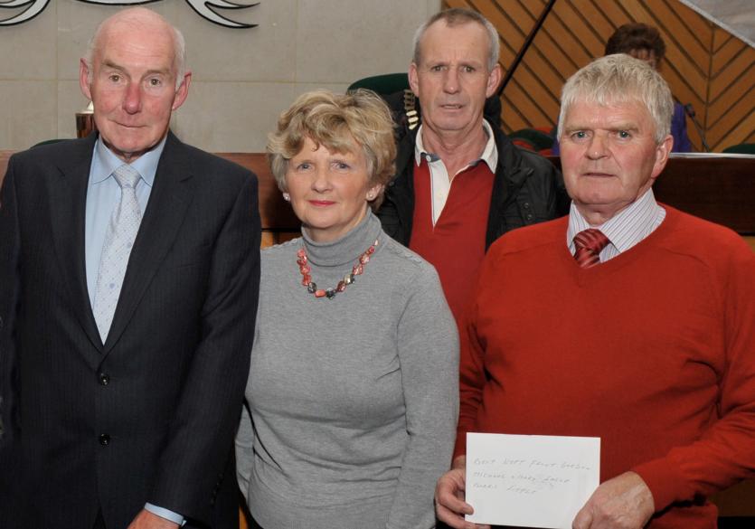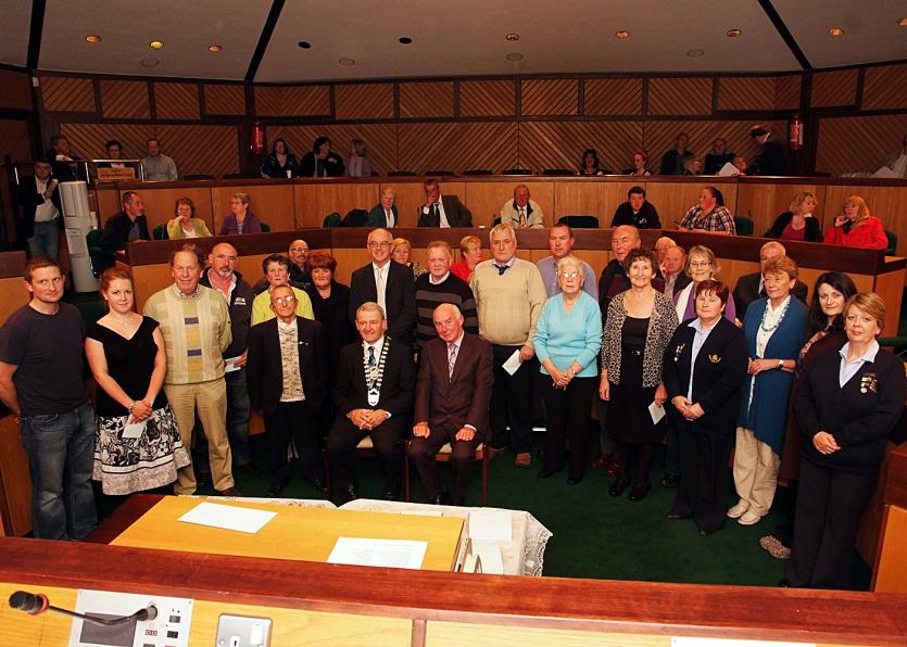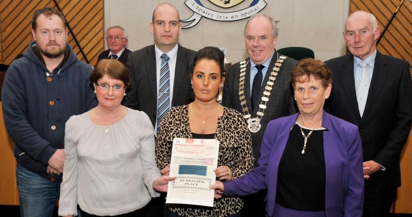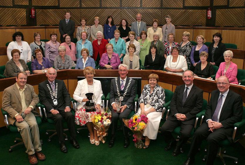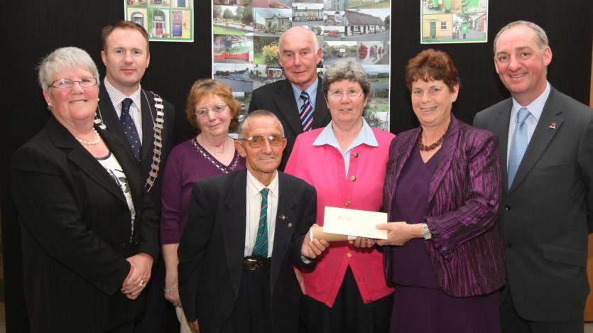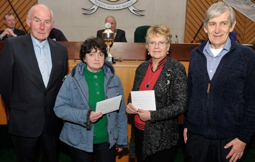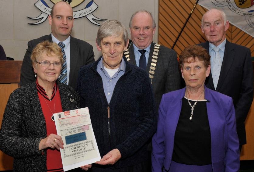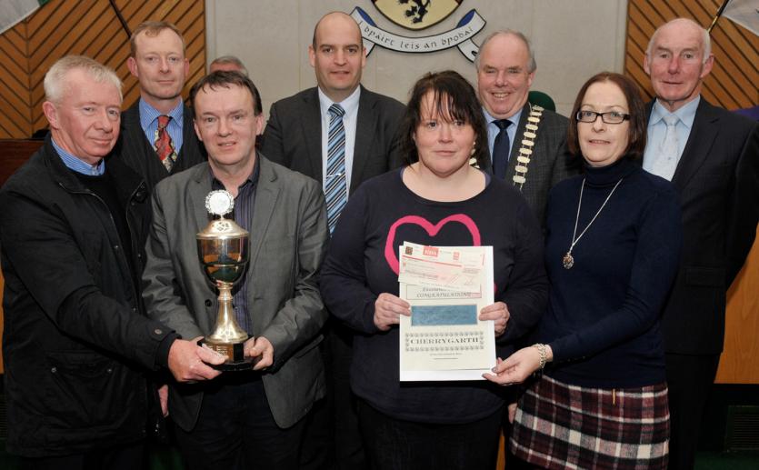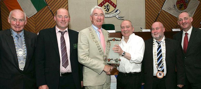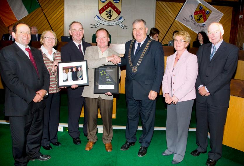 Mary Carroll, Bernard Fitzpatrick, Cllr. Jerry Lodge, Ann Smith and Cllr. Kathleen O'Brien representing Portlaoise are presented with their Best Built Environment award Category D by Cathaoirleach of LCC James Daly MCC; Noreen Byrne, chairperson Laois Tidy Towns and County Manager Peter Carey at County Hall for the Laois Federation of Tidy Towns awards for 2009. Picture: Alf Harvey.
