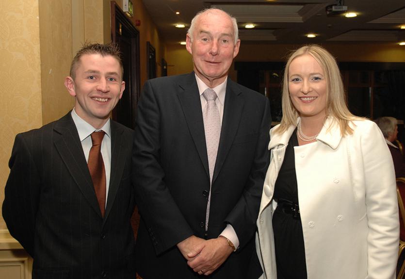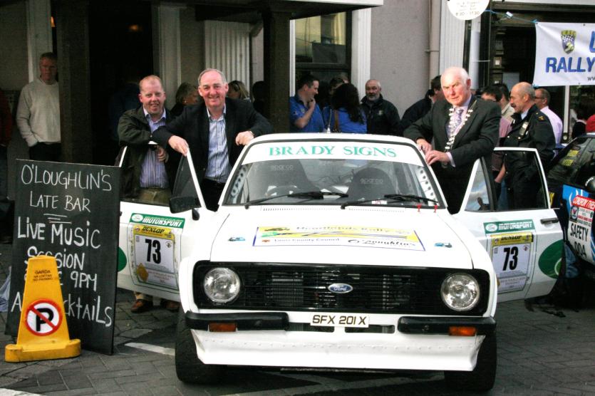 At the launch in O'Loughlins Hotel of the Laois Rallysport Club's Heartlands Stages Rally supported by main sponsors Laois County Council and O'Loughlins Hotel Portlaoise, Dom Reddin (Acting Tourism Officer Laois Co.Co.) Peter Carey (County Manager) and Jerry Lodge (Cathaoirleac Portlaoise T.C.) with Lar Brady's Brady Signs Mk2 Escort. Photo:Tim Keane.