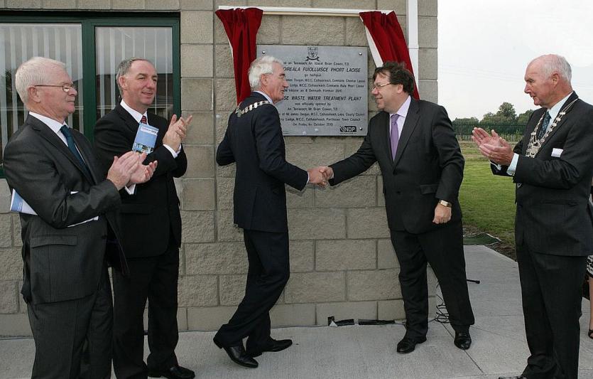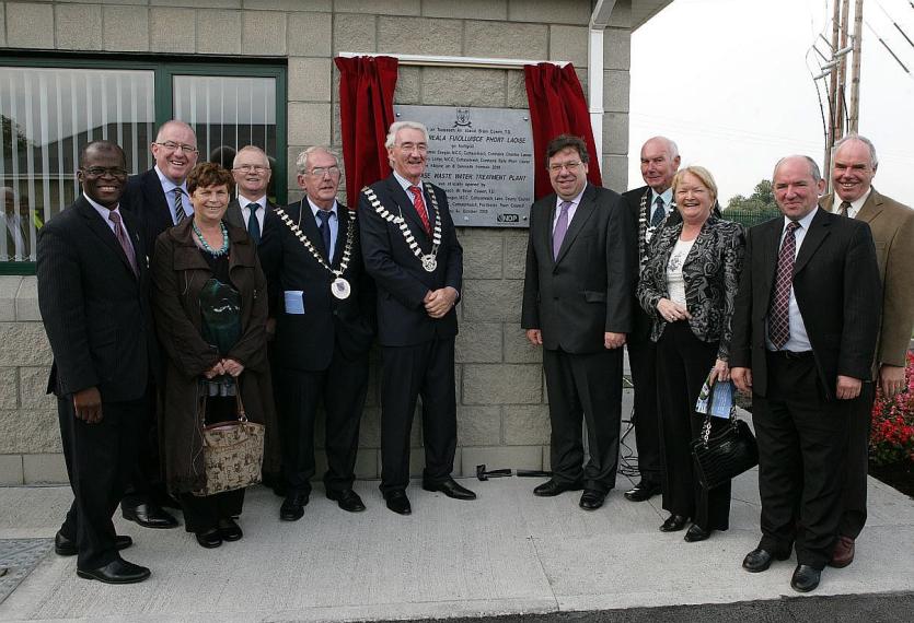 Taoiseach , Brian Cowen , T.D., pictured with Clr.James Deegan,(Cathaoirleach- Laois Co.Council ) , Clr. Jerry Lodge ( Cathaoirleach -PortlaoiseTown Council ) , Clr. Oliver Payne (Cathaoirleach - Mountmellick Town Council ) , Clrs. Rotimi Adabori , Dep. Charles Flanagan , T.D., Clr.Kathleen O'Brien , Gerry Gibson ( DIrector of Services ) , Clrs. Mary Sweeney , P.J.Phelan and John Joe Fennelly ,at the Official Opening of Portlaoise Main Drainage Scheme on Friday last . Photo: Michael Scully