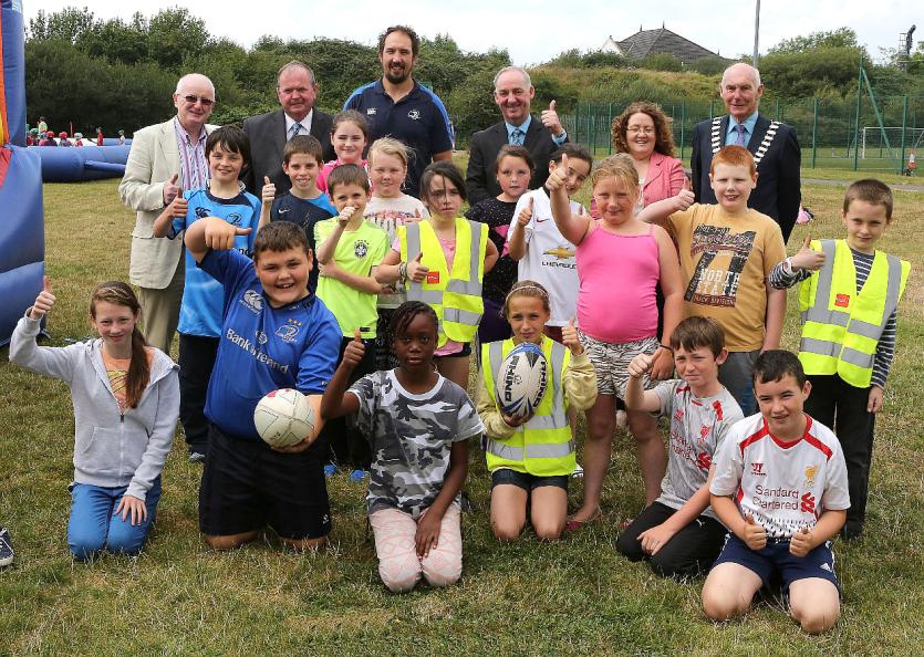 Thumbs up from Rugby participants at the " Games on the Green " Finale at Portlaoise Leisure Centre with visitors - Gerry Kavanagh ( Chairman , Laois Co. Board ) , Liam O'Neill ( G.A.A. President ) , Alex Mihajlovic ( Leinster Rugby C.C.R.O. ) , Peter Carey ( C.E.O. Laois Co. Council ) , Anna Marie Delaney ( Director of Services - Laois Co. Council ) and Clr. Jerry Lodge ( Dep. Cathaoirleach - Laois Co. Council ).Photo: Michael Scully