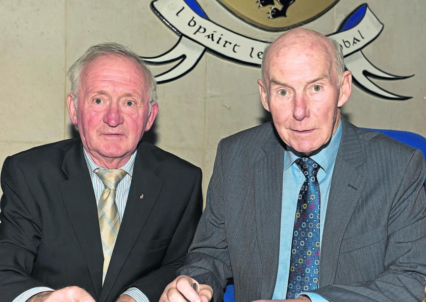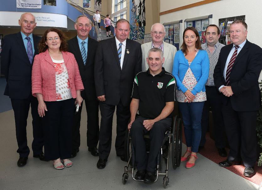 Visitors to the " Games on the Green " Finale , paid a visit to Laois Sports Partnership Office at Portlaoise Leisure Centre. ( l. to r.) Clr. Jerry Lodge , Anna Marie Delaney ( Director of Services ) , Peter Carey ( C.E.O. Laois Co. Council ) , Liam O'Neill ( G.A.A. President ) , Gerry Kavanagh ( Chairman , Laois Co. Board ) , Garrett Culliton ( Disability Officer ) , Catriona Slattery ( Administrator) , Niall Handy ( Sec. Laois County Board ) and Jim Bolger ( Vice- Chairman , Leinster Council / Health & Safety Officer - Laois Co. Council )Photo: Michael Scully
