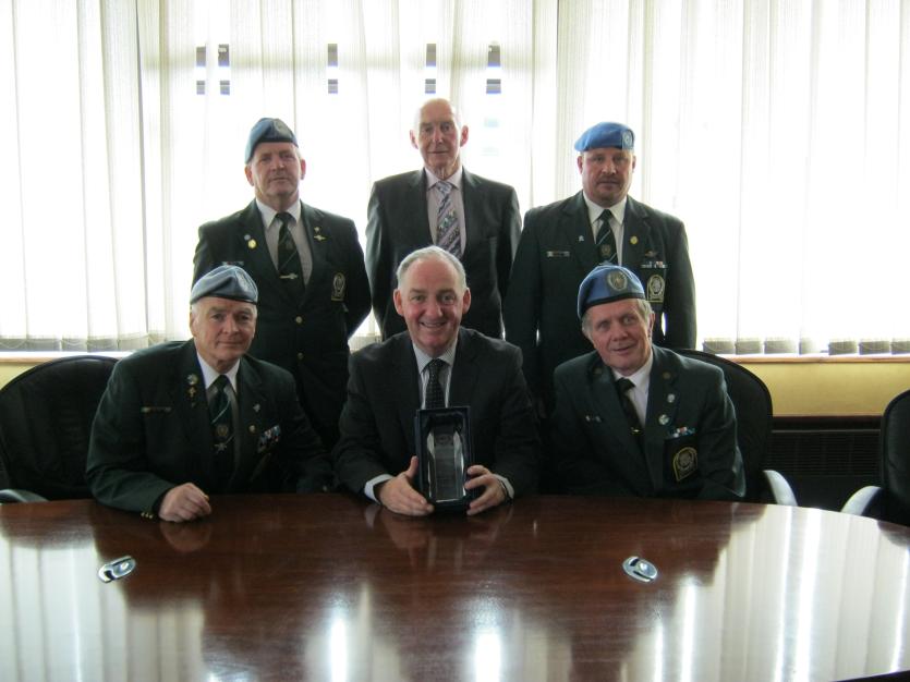 Laois' United Nations veteran Post 27 making a presentation to Laois County Council Chief Executive Peter Carey who is leaving for Kildare. Tony Flanagan thanked Peter Carey for all his support with the Post and Paddy Harding presented him with a piece of glassware. Back: Jimmy Shiels, Jerry Lodge, Michael Thompson. Front: Paddy Harding, Peter Carey, Tony Flanagan