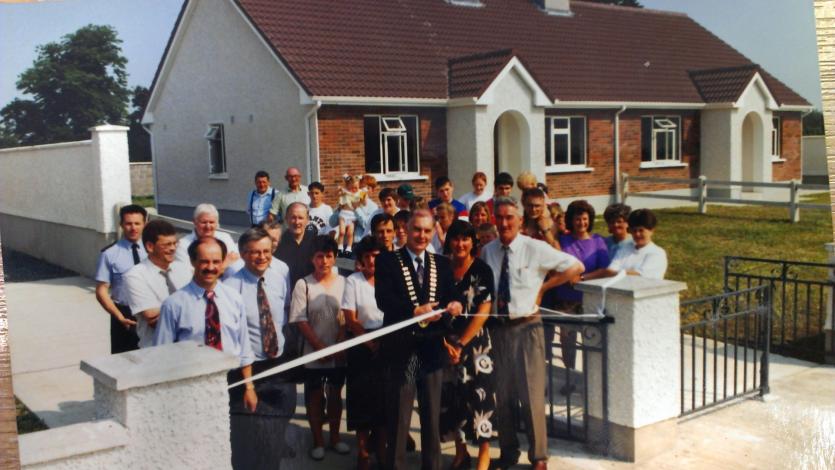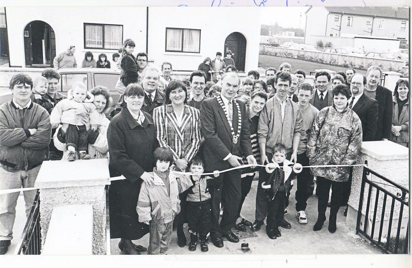 Times past: Cllr Jerry Lodge, Cathaoirleach, Laois County Coucil cuts the ribbon on four of 16 local authority houses to be built in Stradbally. Pic: Alf Harvey.