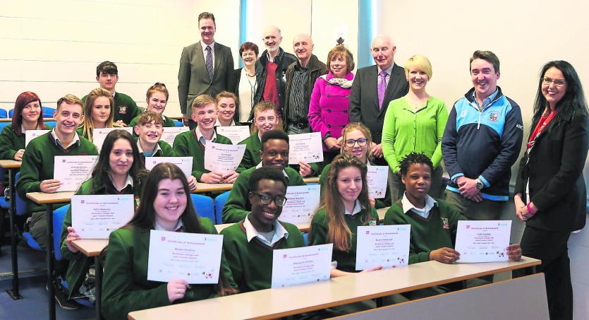 5th. Year students at Portlaoise College who were presented with Certificates of Achievements in the " Skills@ Work" Programme 2015/2016 , pictured with: Tom O'Connell , Larry Deevy and Rebecca Gillespie - Laois Co. Council. , Clr. Jerry Lodge , Rose Doolin and Georgina Ireland ( Community Services - Laois Co. Council ) , Keith Mc.Clearn ( Portlaoise College Co-ordinator ) ,Clodagh Gorman ( Schools Business Partnership ) and Noel Daly ( Principal , Portlaoise College ).Photo: Michael Scully