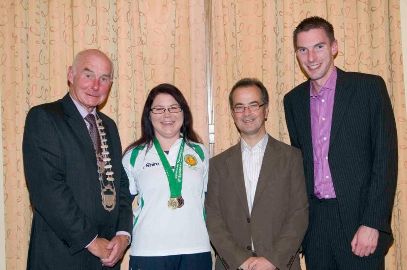 Emma O’Sullivan receives her award. Also pictured is Jerry Lodge (Portlaoise Mayor), Martin Doody (Laois IKA) and Pauric Lodge