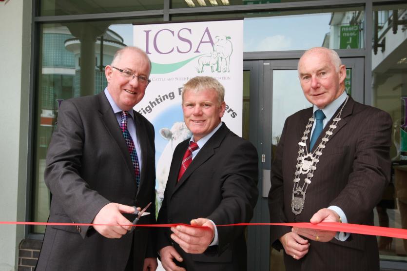 ICSA President, Gabriel Gilmartin (centre) with Deputy Charlie Flanagan, TD for Laois Offaly and Jerry Lodge Mayor of Portlaoise cutting the tape at the official opening of the National offices of the Irish Cattle and Sheep Farmers' Association (ICSA) which are located at 3 Gandon Court, the Fairgreen, Portlaoise. Picture: Alf Harvey,