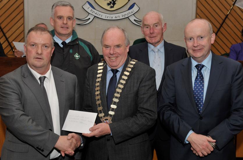 Pictured at the Cathaoirleach's reception for the Gordon Bennett Irish Classic Car Run , at County Hall , Portlaoise on Friday last , were: Clr.Jerry Lodge ( Chairman Portlaoise Town Council ) , John Corcoran ( Chairman - Gordon Bennett Irish Classic Car Run Comm. ) , Clr.James Deegan ( Chairman , Laois County Council ) making a presentation to Mario Corrigan -Kildare Library (who gave an illustrated talk on the Gordon Bennett Race ) , Clr . Stephen Lynch (Chairman , Mountmellick Town Council ) and Peter Carey ( Laois County Manager ) Photo: Michael Scully.