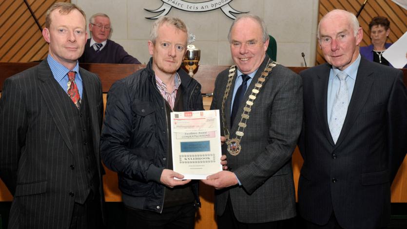 Portlaois Tidy Estate Award Winners at County Hall Mon 10-12-201 Winner of Best Kept Shopfront Main St. was Gerry Browne Jewellers, seen here receiving his award from Portlaois Tidy Towns Committee Chairman, Jerry Lodge.