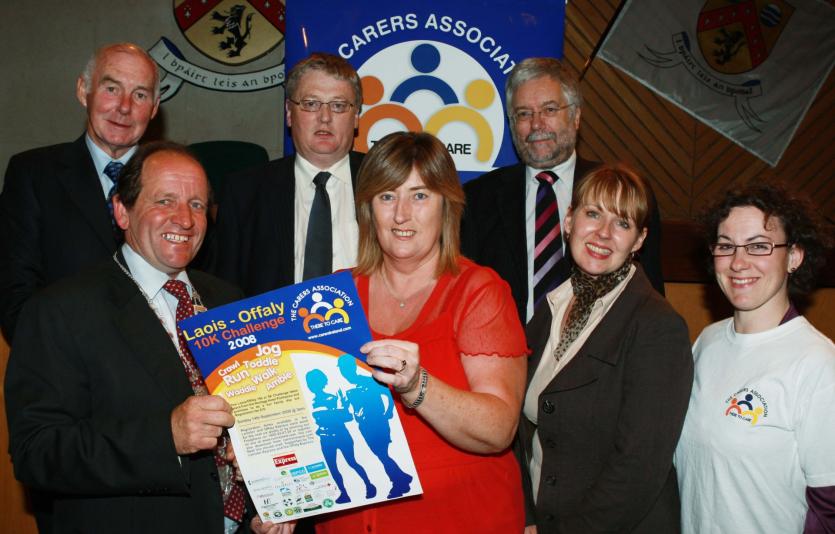 At County Hall for the launch of The Carers Association Laois-Offaly 10K Challenge 2008, from left: Cllr. Jerry Lodge, Mayor of Portlaoise Willie Aird; Minister John Moloney TD; Annette McCaul, Adrian Violett, Emma Murphy and Ann Nolan, The Carers Association. Picture: Alf Harvey.