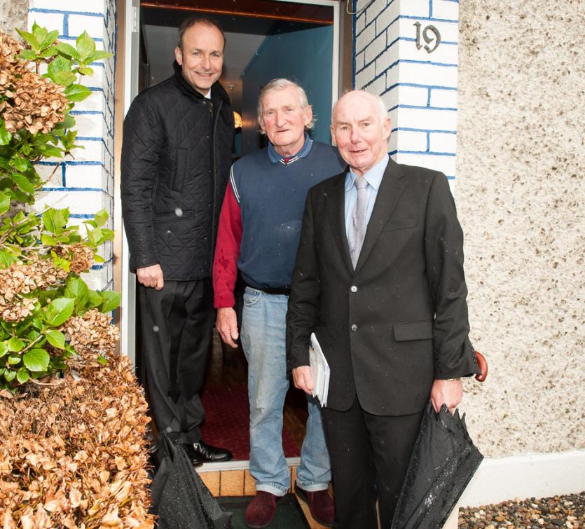 Michael Martin and Gerry Lodge at Portlaoise County Laois. Pictured are St. Brigids Place resident Tom Lalor along with Fianna Fail Leader Micheal Martin and Cllr. Gerry Lodge. Photo Denis Byrne.