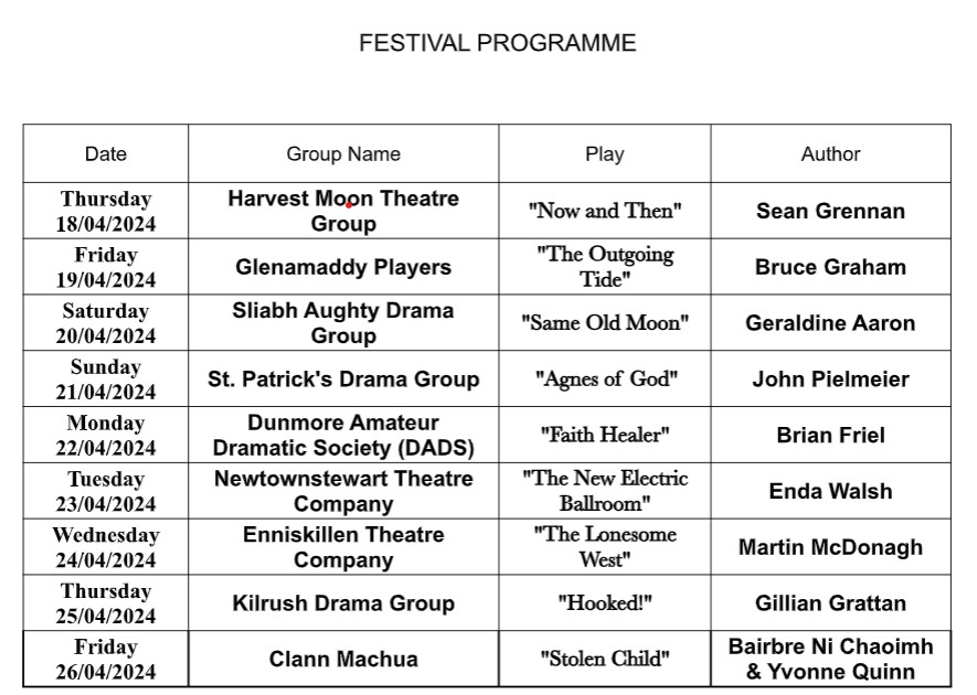 Highlighting the importance of amateur theatre in Ireland, Patricia Conroy, Festival Director commented: “This event is not just a competition; it's a celebration of the passion, dedication, and creativity of amateur drama groups across the country and we are proud to play host to such a talented group of performers.”