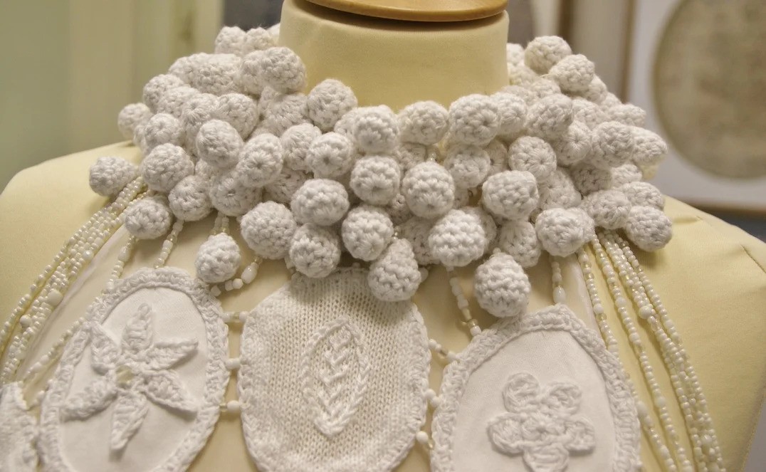 Detail of a dress incorporating Mountmellick Work embroidery on display at Mountmellick Museum.