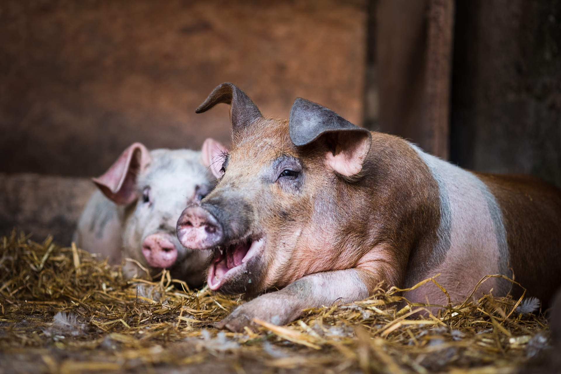 "I went into the pig sty and sat down with two young pigs. They rushed all around me and were all excited to see something happening in their pig pen.