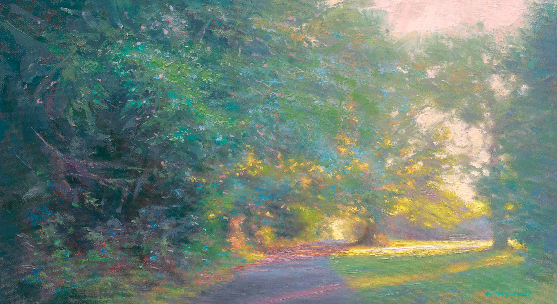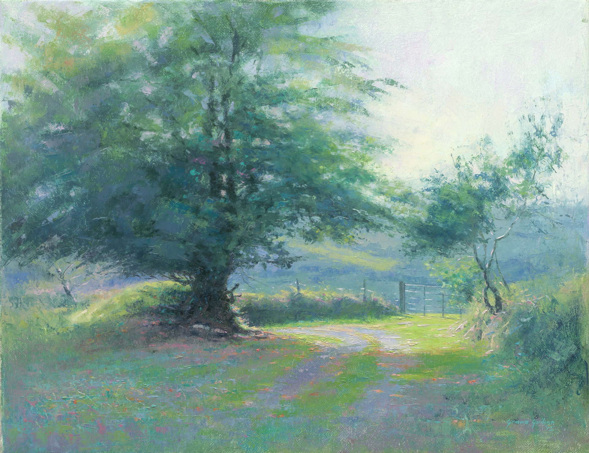 Soft pinks and evening greens of Emo gardens, seascapes of turquoise blue, and resting boats at sunset will be complemented by her latest work of the Slieve Bloom in moon light, where stately figures merge in an ethereal procession in “The Knights Return”.