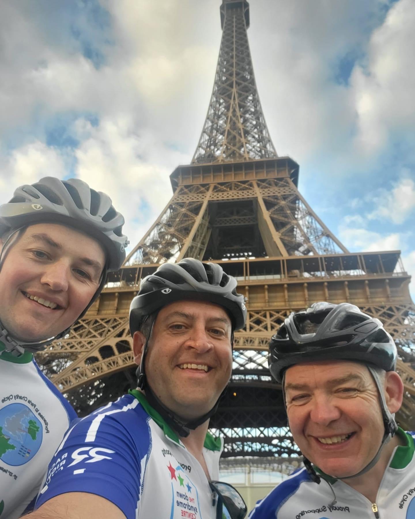 The lads pictured at the Eiffel Tower after their Portlaoise to Paris cycle last year