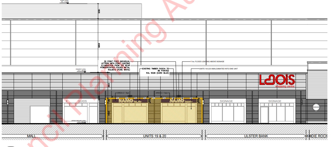 Laois Shopping Centre owners Lindat Ltd, seek planning permission to amalgamate two existing ground floor retail units, numbers 19 and 20, into one larger unit, beside the former Ulster Bank, and several doors away from the Eddie Rocket's restaurant.