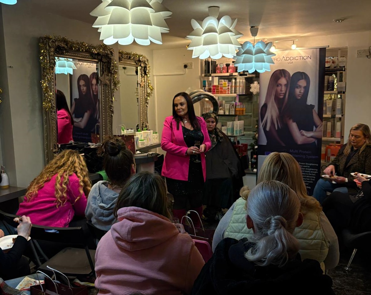 Guest speaker Olivene Bartley speaking to the audience at the ProAddiction demonstration night in Redmond's Hair and Beauty salon.