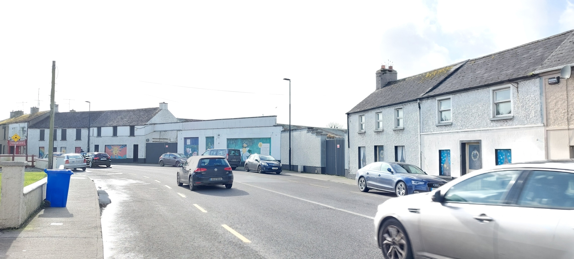 The site stretches back to Twomey Terrace housing estate, and includes three houses, two showrooms and two workshops. A well known landmark on the N80 road, its boarded up windows are painted with murals on behalf of Mountmellick Tidy Towns.