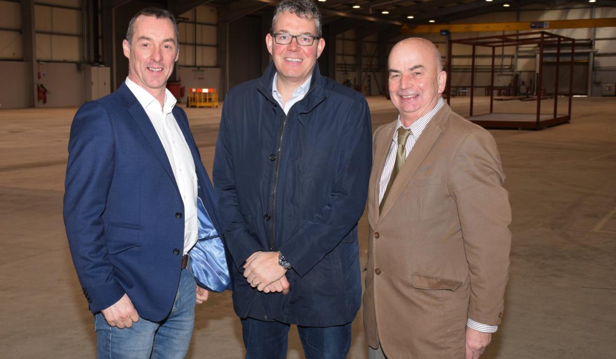 On the factory floor. L-R Kevin Brennan Managing Director of Modubuild, John Comerford Managing Director of Asgard, and Maurice Shortall. Photo: by Brenda Murtagh