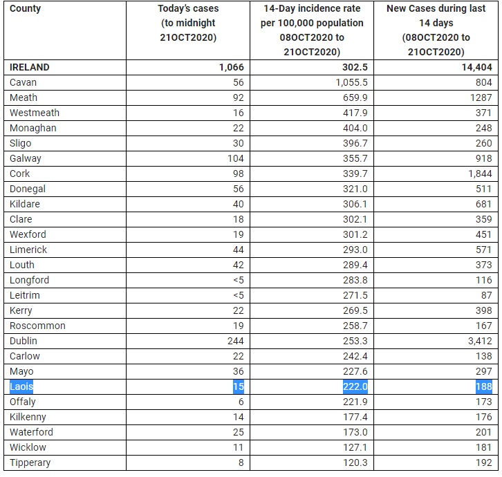 The extra cases in Laois push to 222 per 100,000 the incidence of the virus in Laois. There have been 188 new cases in the two weeks to October 21. The recent upsurge in the virus has pushed the total number of confirmed cases to 713.