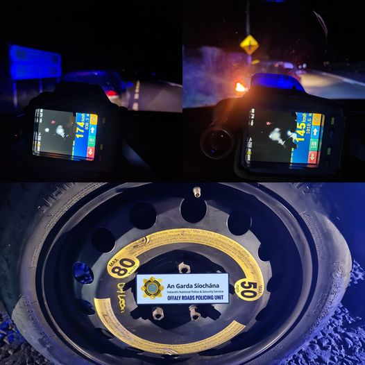 “Offaly Roads Policing Unit detected a car speeding. 174km per hr in a 100 zone. Car also fitted with a space saver tyre . Driver arrested. Charged with dangerous driving,” Gardai said.