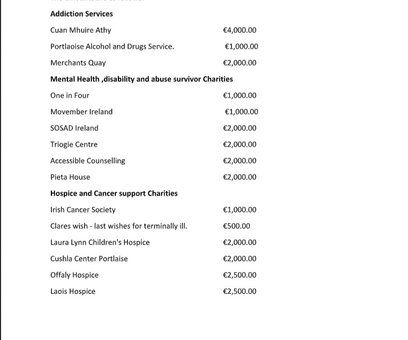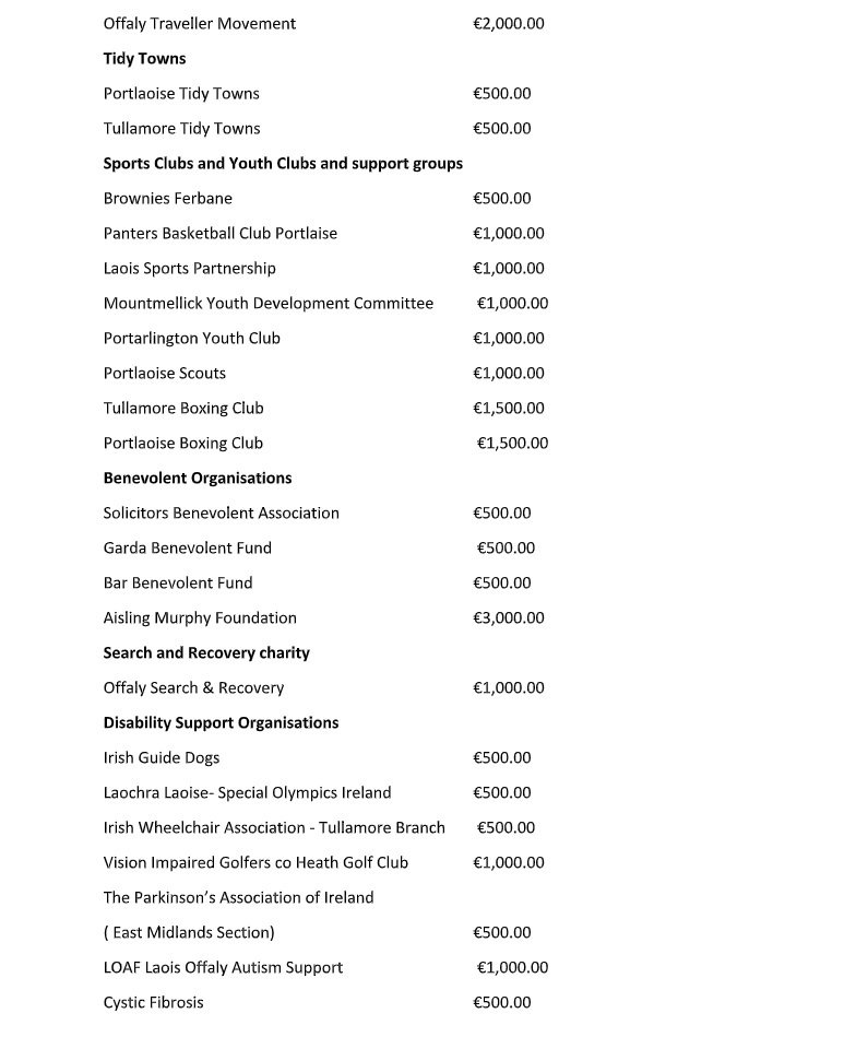 The Midlands Prisoner Support group received €2,000, the tidy towns €1,000, benevolent groups €4,500 and Disability Support organisations €5,000. Finally, support for “older” people received €2,500,” Judge Cody concluded.