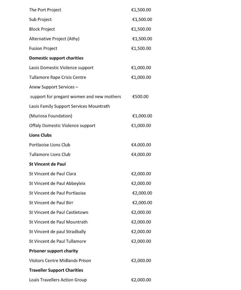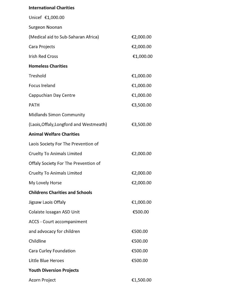 “We were able to assist small local projects such as an ASD unit in a local school, to large international charities such as UNICEF. However, most donations are for local well deserving charities and organisations who provide enormous assistance to the communities of Laois and Offaly.