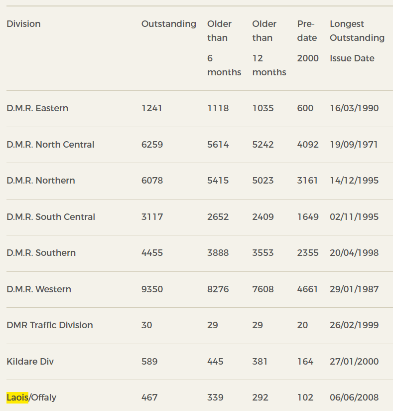 According to the figures, there were a total of 467 outstanding warrants in Laois Offaly at the end of April. Remarkably, 102 of the bench warrants are over five years old as they predate the year 2020 and the oldest outstanding warrant in Laois Offaly is 17 years old and dates from 2008. Nationally, the oldest outstanding warrant was issued in Dublin in 1971 and is 54 years outstanding.