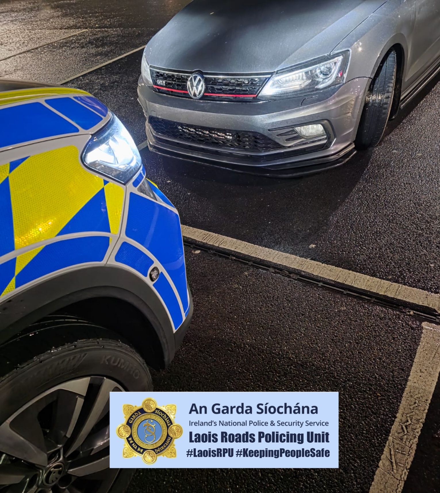 On a recent patrol, Laois Gardaí stopped a grey Volkswagen Jetta that had no front number plate, and an illegal number plate fixed to the rear.