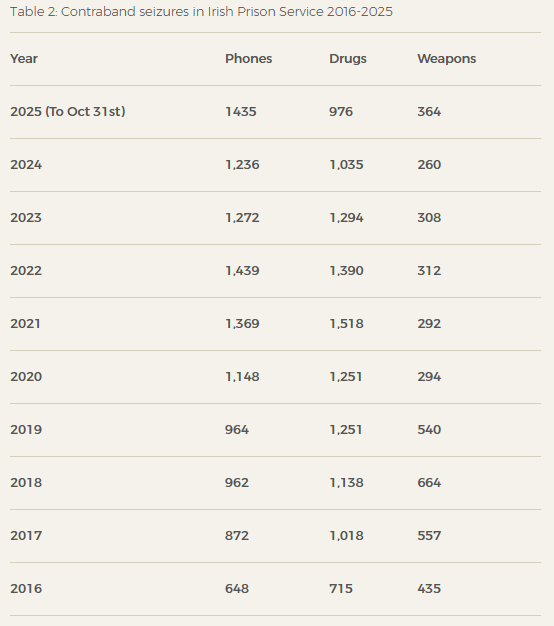 Minister O’Callaghan provided a breakdown of items seized in prisons across the country.