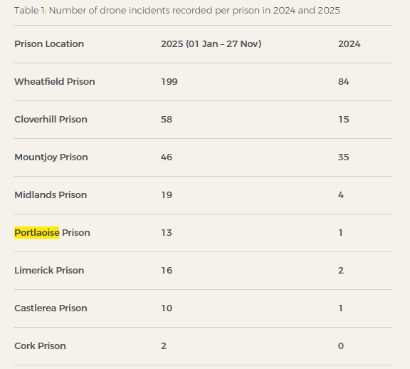 There has been a sixfold increase in recorded drone incursions at prisons in Portlaoise in 2025 compared to 2024.