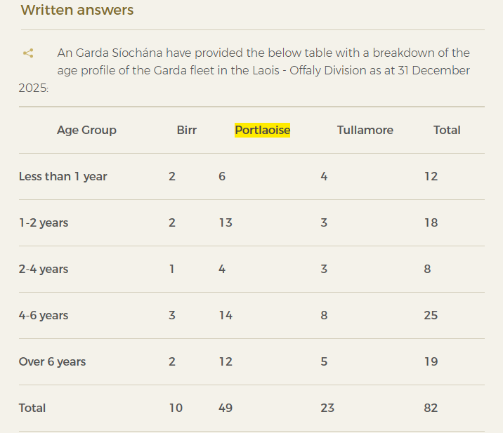 He provided a breakdown of the number and approximate age of the vehicles across the Laois Offaly Garda Division as of December 31, 2025.