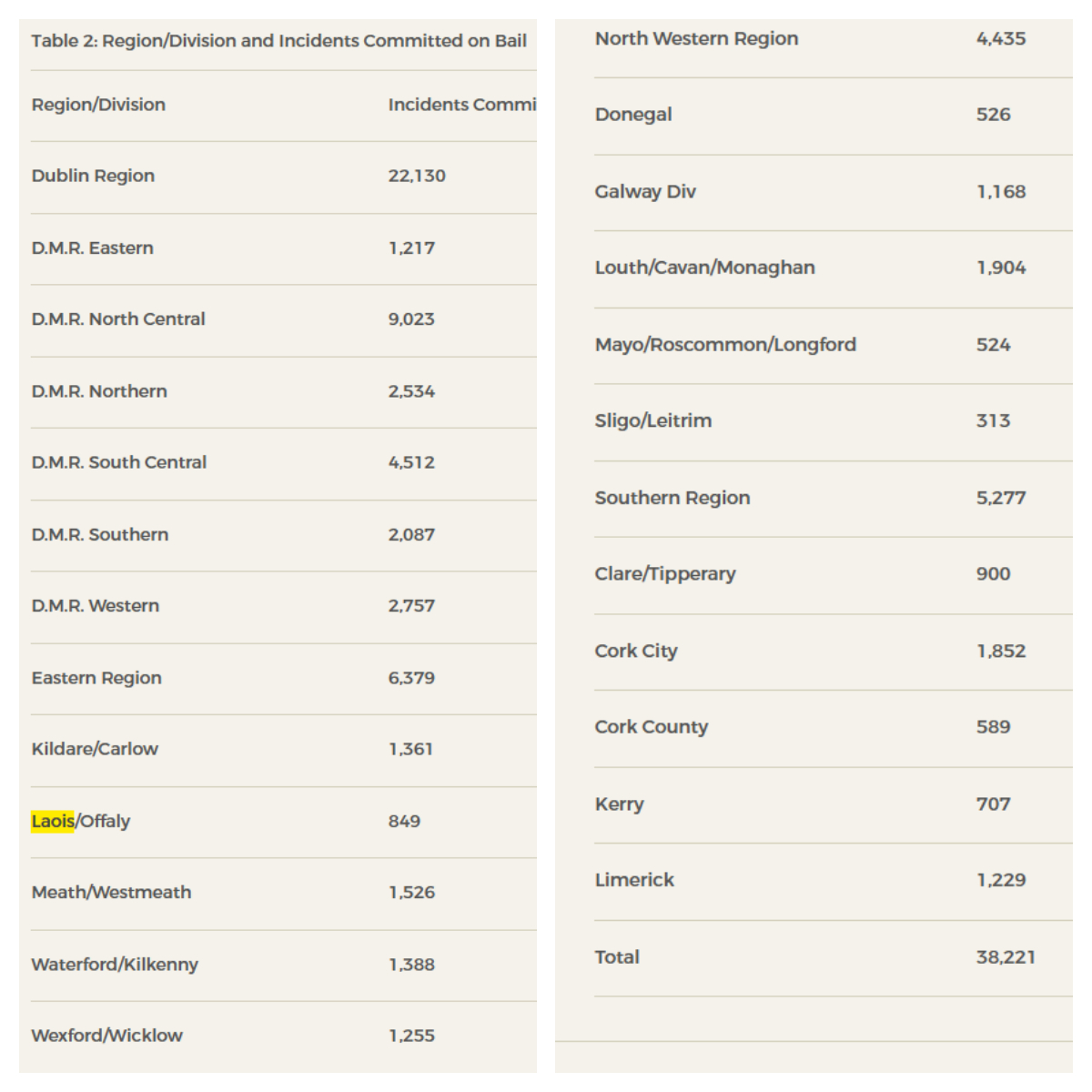 Garda figures reveal 849 crimes were committed in Laois and Offaly in 2025 by suspects who were on bail at the time.