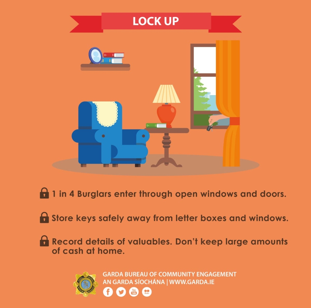 “Summertime offers plenty of opportunities to burglars. Sheds left open and bicycles left unsecured in gardens are easy targets for the burglar. Remind children to lock their bicycles when not in use. Secure tools, ladders and other valuable equipment in sheds or garages; with quality chains and locks as an extra deterrent. Additional security on the outside shed or garage door will delay and hopefully deter the burglar. Remember to lock sheds, garages and house doors and windows. Unfortunately, our bad habits allow the burglar to enter our property too easily. One in four burglars enter through an open door or window in the summer, so lock up and light up," he said.