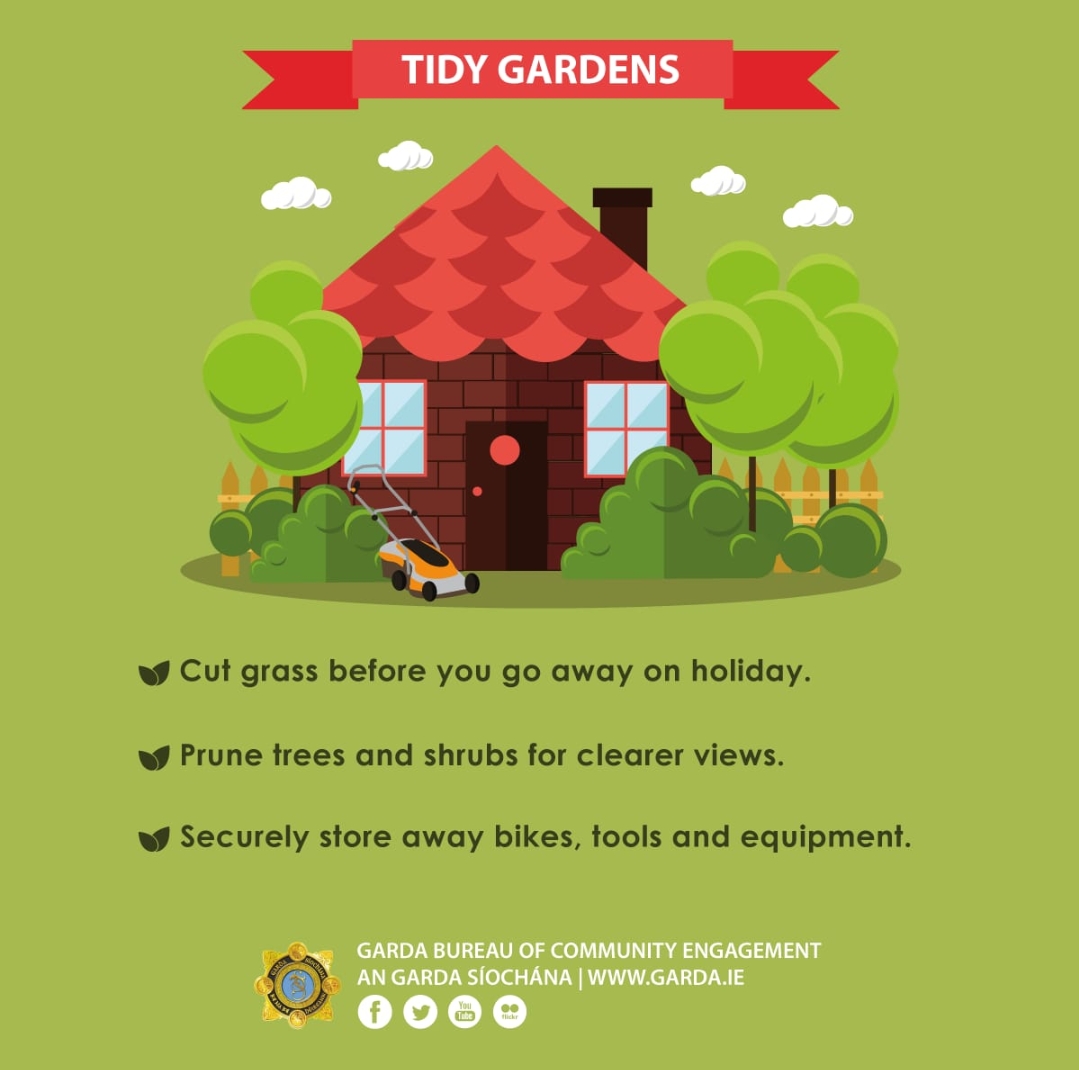 “An untidy lawn gives the impression of a vacant home which is more likely to be targeted by burglars. Overgrown hedges or bushes can provide cover for intruders. Ladders and tools left unsecured are often used by burglars to gain entry to homes.