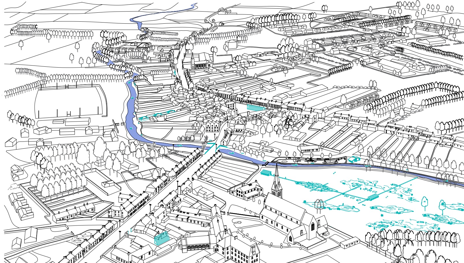 The team then made a series of drawings, chiefly a 'birds eye view' line drawing of the town with their ideas in cyan.