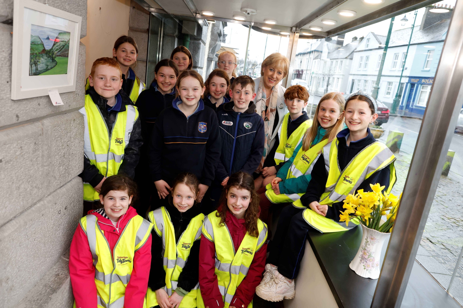 Former Minister Heather Humphreys met local children when she visited Abbeyleix in 2024 to launch that year's SuperValu Tidy Towns Awards.