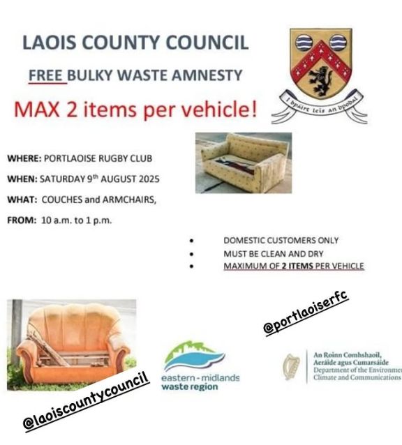 The bulky waste amnesty takes place at Portlaoise Rugby Club on Saturday, August 9 between 10am and 1pm.