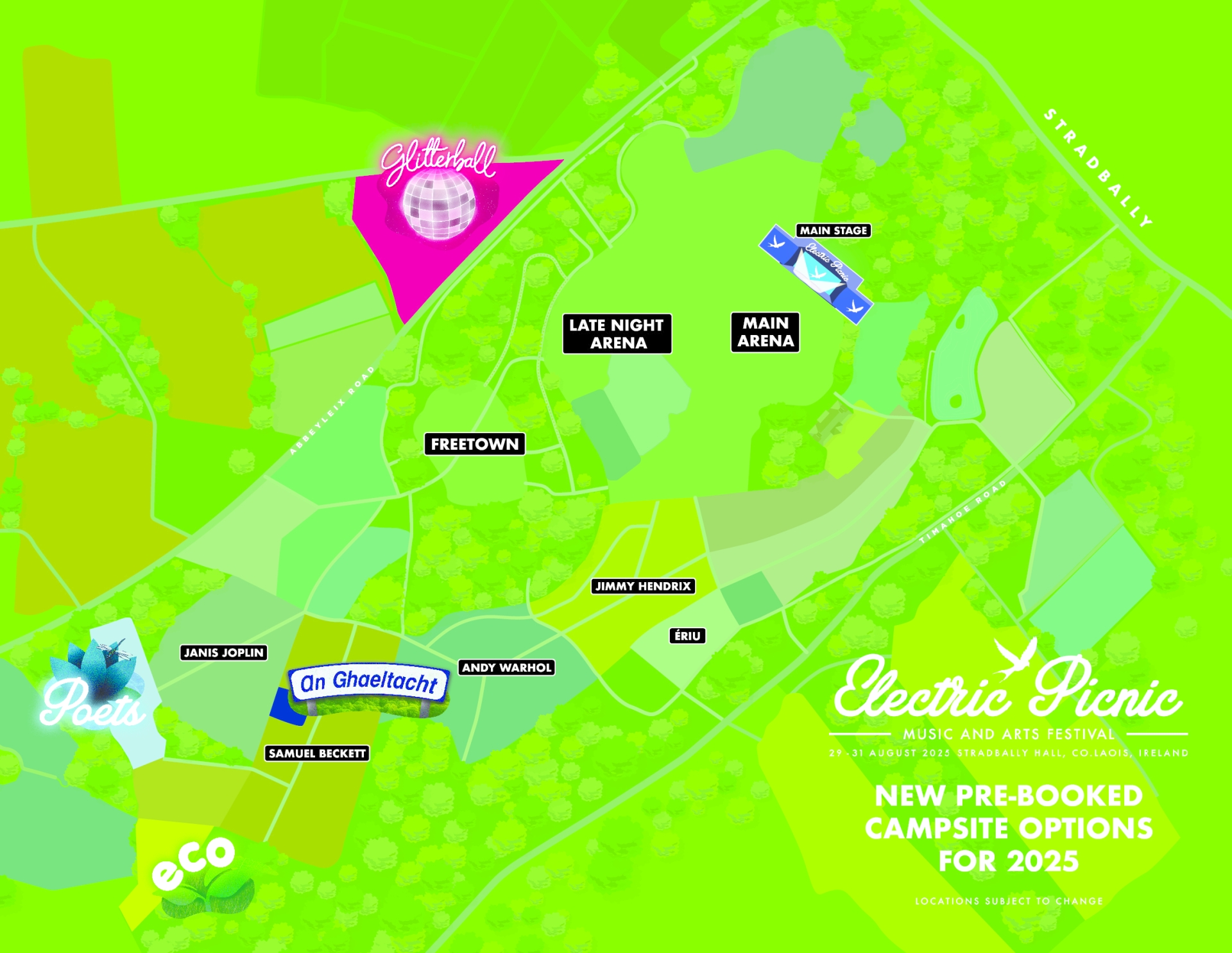 These sites include the brand-new Glitterball Campsiteadded to the reformatted Poets Camp and the existing Eco and An Láthair Ghaeltachta – all designed to improve your Electric Picnic experience. More below new campsite map.