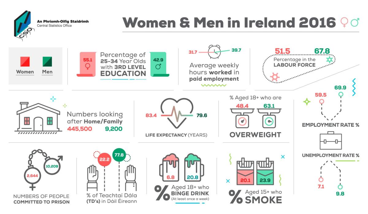 The Central Statistics Office has published “Women and Men in Ireland 2016” which presents over 70 indicators that identify important gender differences in the activities of men and women and also presents the situation in Ireland in an international context.
