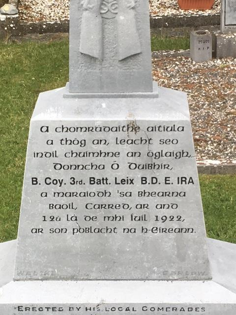 As the gunfire subsided and the smoke cleared, members of the local community timidly approached Capard to survey the wreckage. Emerging from a large silver safe in the house Edward Kenny went out into the yard where he found Dwyer’s body fifty metres from the back door; the spot marked today by a small iron cross and memorial stone. A man named McEvoy agreed to bring Dwyer’s corpse on a horse and cart to ‘auld John Moloney’ and according to local lore ‘they doctored him up before they brought him home’. Worried that the body would be captured by the Free State military, thus denying the opportunity of a burial, it was hastily brought across the mountain and conveyed under escort to his home at Shanrath, Wolfhill, near the village of Ballylinan, almost thirty miles away. On Friday morning 14 July, after requiem mass at Wolfhill celebrated by Rev W. Wilson, Dwyer was buried in the adjoining cemetery. Three volleys were fired over the grave which was quickly filled in. To his parents and friends, Dwyer had sacrificed his life ‘while fighting for the Republic at Capard’. Writing to his parents, Lar Brady noted that ‘poor Denis died bravely and courageously and his death will be an inspiration to his comrades’. Others offered their sympathy assuring his parents that ‘his name is now added to the long roll of new martyrs’.